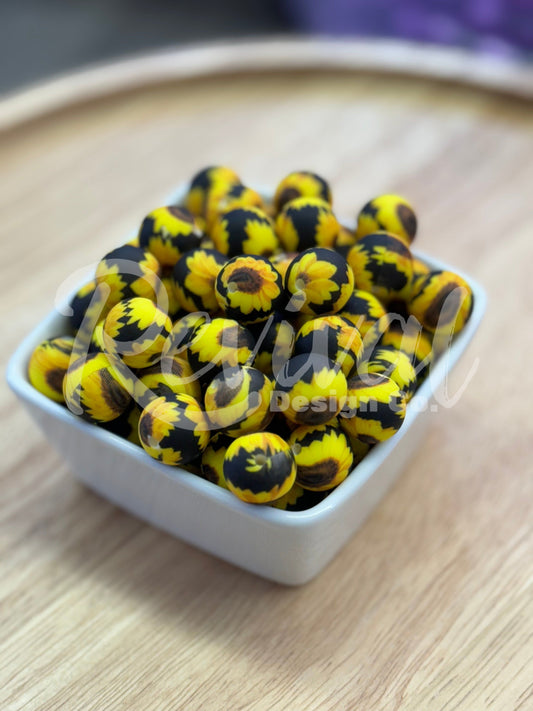 15mm Patterned Silicone Bead - Black Sunflower